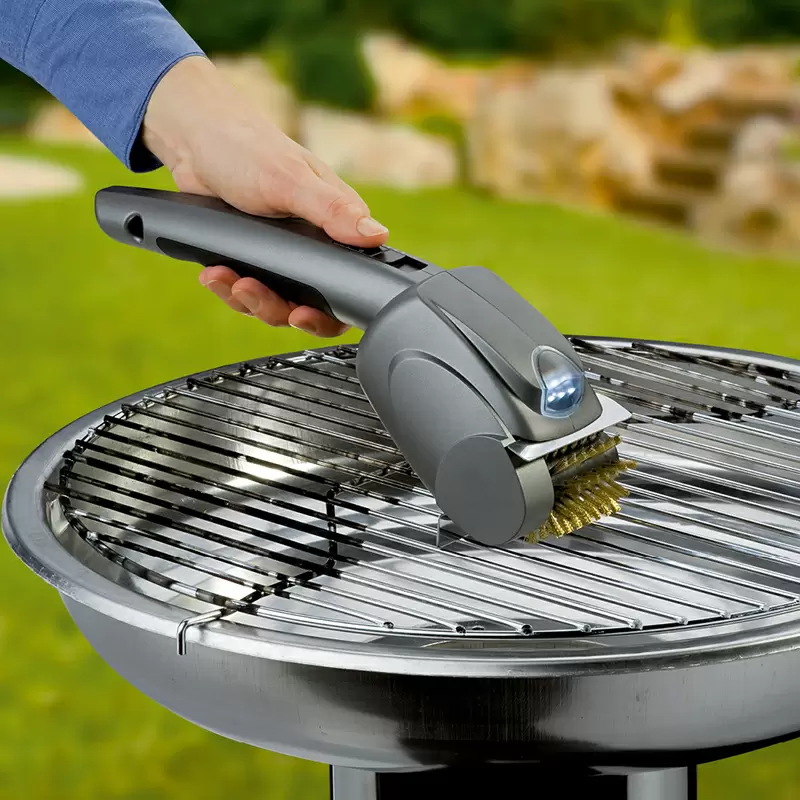Die rotierenden Messing- oder Hartkunststoff-Bürsten des elektrischen Grillreinigers sorgen mit 430 Umdrehungen pro Minute für blitzblanke Ergebnisse. Fettbeläge, harte und eingebrannte Verkrustungen werden zuverlässig entfernt.