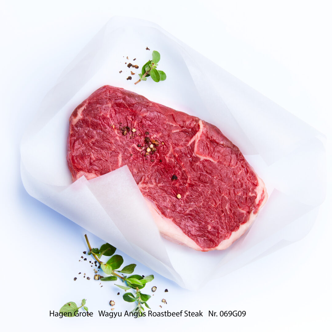 Das Roastbeef ist ein Edel-Steak vom hinteren Rücken der Wagyu-Angus-Rinder. Im Ganzen wiegt es mehr als 5 kg. Die quer zur Faser geschnittenen Steaks (je ca. 300 g) verfügen über eine charakteristische Fettmarmorierung, die bei der Zubereitung auf dem Hochtemperaturgrill für ein saftiges, geschmacklich anspruchsvollen Ergebnis sorgt.