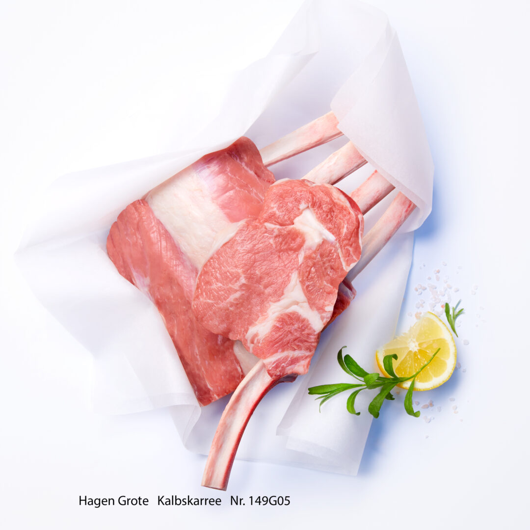 Mit Oberhitze zubereitet ist hochwertiges Kalbsfleisch eine einmalige Spezialität. Die helle Farbe gibt Aufschluss über die hochwertige Ernährung der Tiere mit Milch, Molke und einer geringen Menge Heu. Aufgrund ihrer behutsamen Aufzucht und des exklusiven Futters ist ihr Fleisch unvergleichlich zart. Kalbskarree, im Ganzen oder zu Koteletts geschnitten, ist mit Oberhitze zubereitet ein Genuss. Der Knochen hält das Fleisch saftig-zart und verleiht ihm geschmackliche Tiefe.