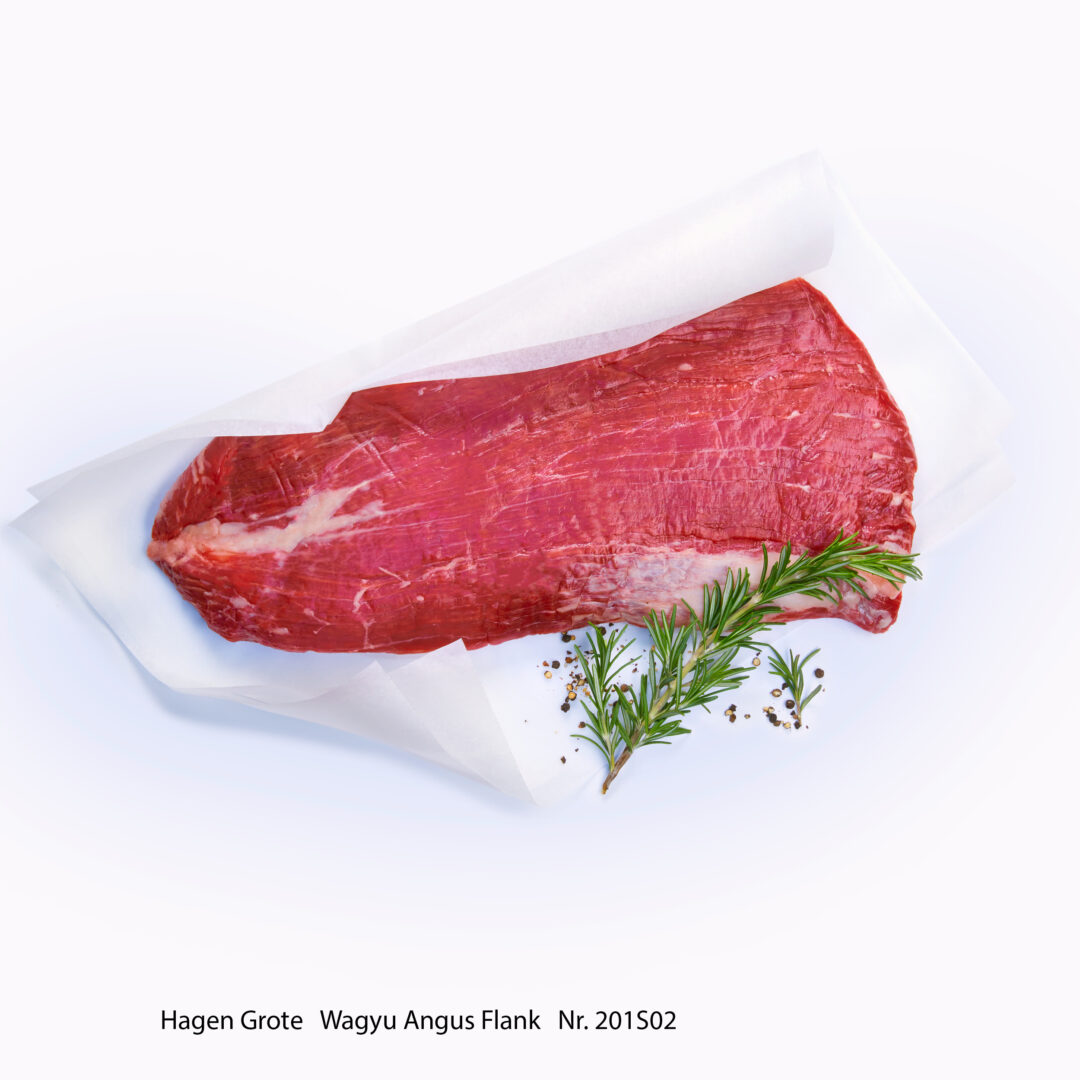 Das Fleisch der Wagyu-Angus-Rinder verbindet in hocharomatischer Weise die Zartheit des Wagyu- mit dem charakteristischen Geschmack des Angus-Rind. Das Flank ist ein unter Fleischliebhabern äußerst geschätzter Schnitt aus dem Bauchlappen der Rinderrasse. Die charakteristische Marmorierung unterstreicht den intensiven Geschmack und hält das Fleisch herrlich saftig. Durch die Zubereitung im Oberhitzegrill bilden sich besonders geschmackvolle Röstaromen aus.