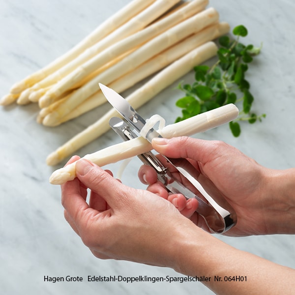 Die zwei gegenüberliegenden, scharfen Edelstahl-Klingen sind perfekt an die Konturen des Stangengemüses angepasst. So schälen Sie Spargel sparsam, schnell und effizient, nichts bricht.