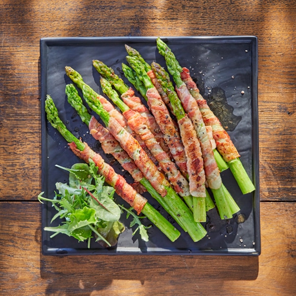 Genießen Sie Spargel etwa als feine Vorspeise – zum Beispiel in Form von Esparrago con bacon – Spargel in Bacon, Spargelsalat mit Orangensauce oder als Emulsion von grünem Spargel auf Entenconfit.