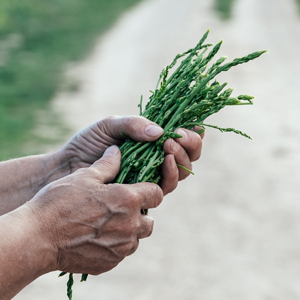 Wilder Spargel ist eine der ursprünglich 220 Arten unserer gezüchteten Spargelsorten und wächst rund ums Mittelmeer. Dort wird er gesammelt und oft an der Straße in kleinen Bündeln angeboten. Seine dünnen, grünen Stängel haben wenig Fruchtfleisch und einen schwach ausgeprägten Geschmack. Im Mai kommt er als sogenannter Waldspargel „Asperge de bois“ aus Frankreich auch zu uns auf die Märkte. Dank steigender Beliebtheit wird er inzwischen ebenfalls gezüchtet.