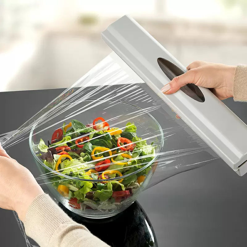 Dieser von uns mitentwickelte Folienschneider trennt dank fein gezahnter Edelstahlklinge mit Federmechanismus die gewünschte Folienmenge exakt von der Rolle. Der Rollenanfang von Frischhaltefolie verklebt dank diesem innovativen Cutter nicht mehr. In der Küche schnell zur Hand ermöglicht der Folienschneider das saubere Abtrennen durch leichten Druck auf den Korpus.