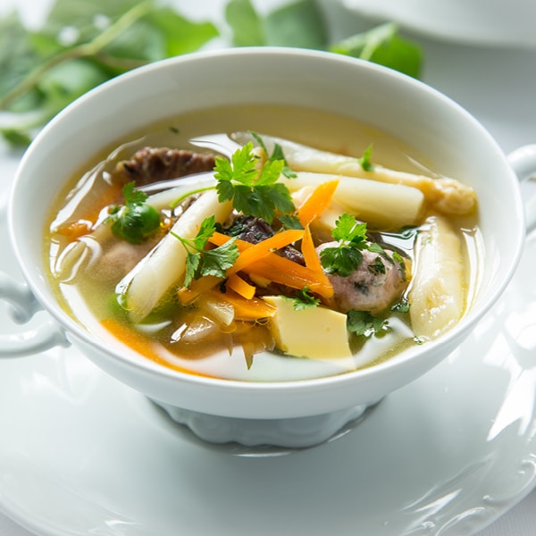 Eierstich ist ein unverzichtbarer Bestandteil der Hochzeitssuppe. Basis ist eine klare Brühe, hinzu kommen regional unterschiedliche Einlagen wie, neben Eierstich, Huhn, Markklößchen oder Spargel. Von seidiger, porenfreier Konsistenz ist diese besonders feine Suppeneinlage, die in Frankreich, wo man sie nur mit Sahne statt halb Milch, halb Sahne, zubereitet, „Royale“ genannt wird.