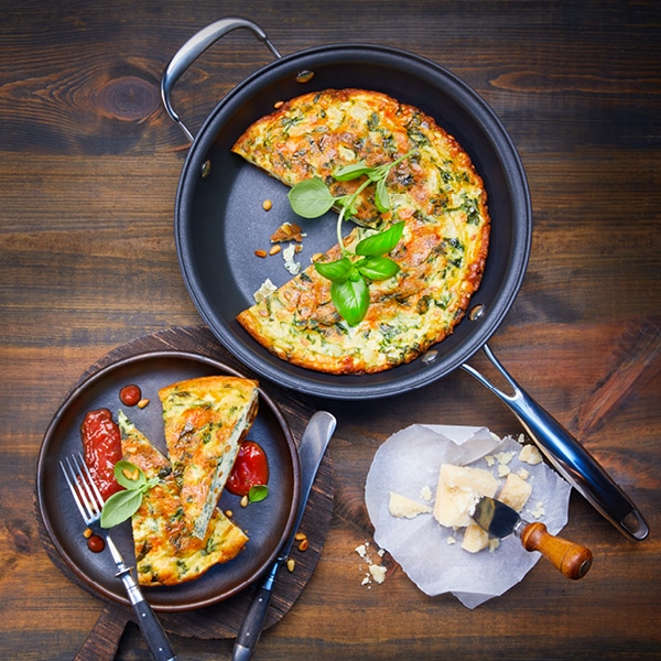 Die Frittata ist ein vielseitiger Alleskönner aus der italienischen Küche. Die herzhafte Eierspeise wird mit Gemüse, Kräutern, Käse, Fleisch oder Fisch zubereitet und begeistert durch Einfachheit und Vielfalt. Im Gegensatz zum Omelett wird die Frittata nicht gefaltet, sondern in der Pfanne langsam gegart und anschließend wie eine Torte serviert. Zahlreiche Anregungen für köstliche Frittatas finden Sie in unserer Rezeptdatenbank – z. B. Zucchini-Spaghetti-Frittata auf Tomaten-Basilikum-Sauce, Blumenkohl-Frittata mit San Marzano Sauce, Paprika-Räucherlachs-Frittata, Mangold-Parmesan-Frittata oder Steinpilz-Frittata.