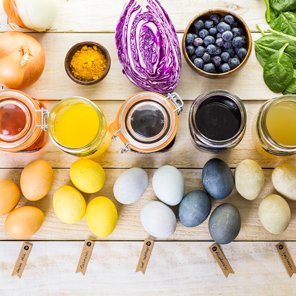 Rot färbt man mit Saft aus gekochter roter Bete oder einem Sud aus roten Zwiebeln. Mit 50 g Kurkuma in einem Liter Wasser gekocht färbt man Eier leuchtend gelb. Zartes Grün lässt sich mit 300 g gekochtem Spinat oder Matetee erreichen. Ein Sud aus Rooibostee oder 300 g Möhren färbt Eier strahlend Orange. Frischer gekochter Rotkohl oder Blaubeeren erzielen ein leuchtend helles Blau. Sobald die gefärbten Eier trocken sind, mit ein wenig Pflanzenöl einreiben, um der Farbe Glanz zu verleihen.