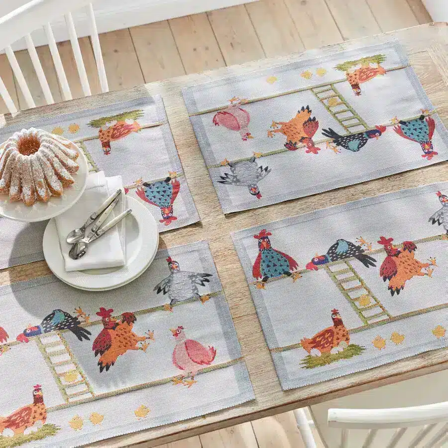 Diese lustigen Hühner auf der Hühnerleiter sorgen auf jedem Tisch für gute Laune. In frühlingsfrischen Farben wird die bezaubernde Tischwäsche in der schwedischen Traditionsweberei Ekelund gewebt.