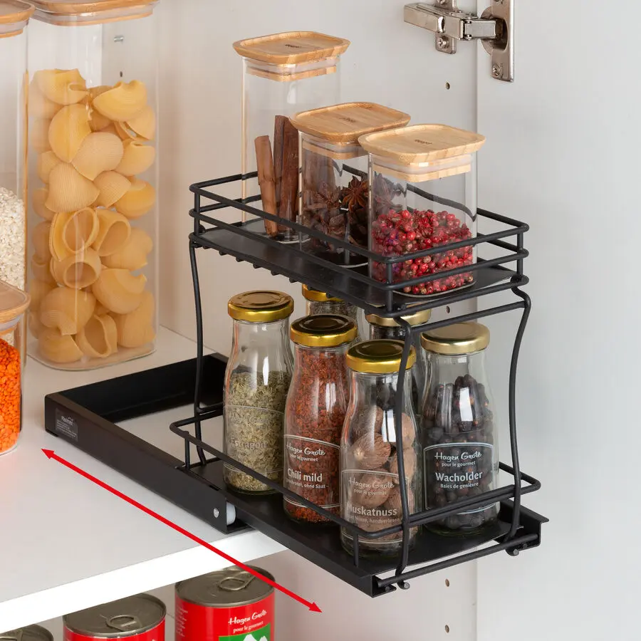 Bis zu 20 Gewürzgläschen passen übersichtlich, wohlgeordnet und leicht entnehmbar hinein. Zum Nachfüllen oder Säubern wird das Regal ganz aus der Halterung entnommen.