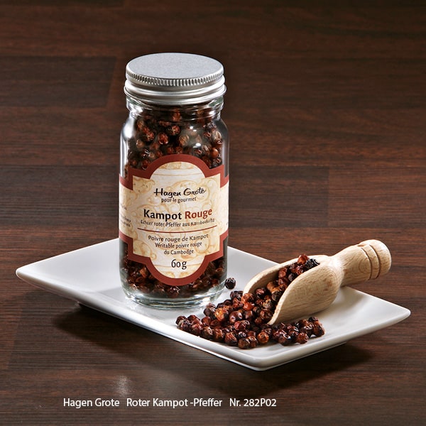 Kulinarisch gilt Kampot Rouge als beste Pfeffersorte der Welt. Von Hand geerntet und im Schatten getrocknet, bekommt er eine typische rotbraune Färbung. Seine besondere Schärfe mit überaus fruchtigen Geschmacksnoten macht ihn zum perfekten Begleiter von kurz gebratenem Fleisch und gegrilltem Fisch. Auch Carpaccio, feine Saucen oder sogar Mangos, Erdbeeren und edle Schokoladendesserts verfeinert er raffiniert.