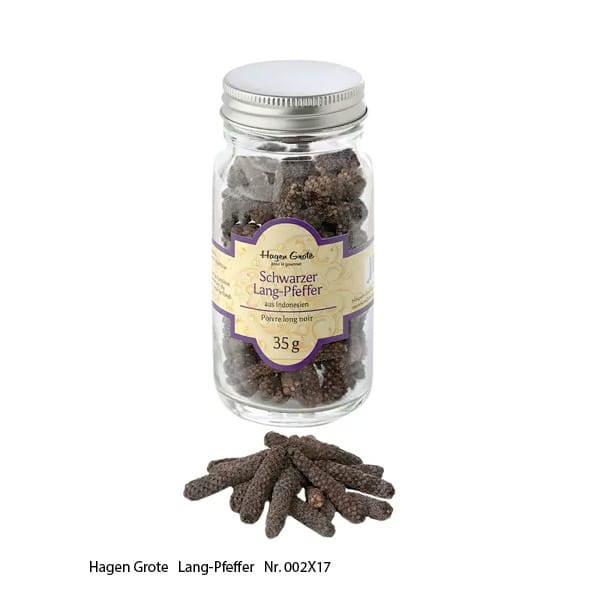 Langpfeffer aus Ostasien ist trotz seiner oval länglichen Frucht ein naher Verwandter des Pfeffers. Die kleinen, zapfenförmigen Ähren im Mörser zerstoßen sind von süßer fruchtiger Schärfe. Mit ihrem leicht erdigen Geschmack, Zitrus- und Ingwernoten sind die ideal zu Wild, asiatischen Schmorgerichten und Currys. Fein gerieben über exotische Fruchtsalate ist Langpfeffer ein Gedicht.