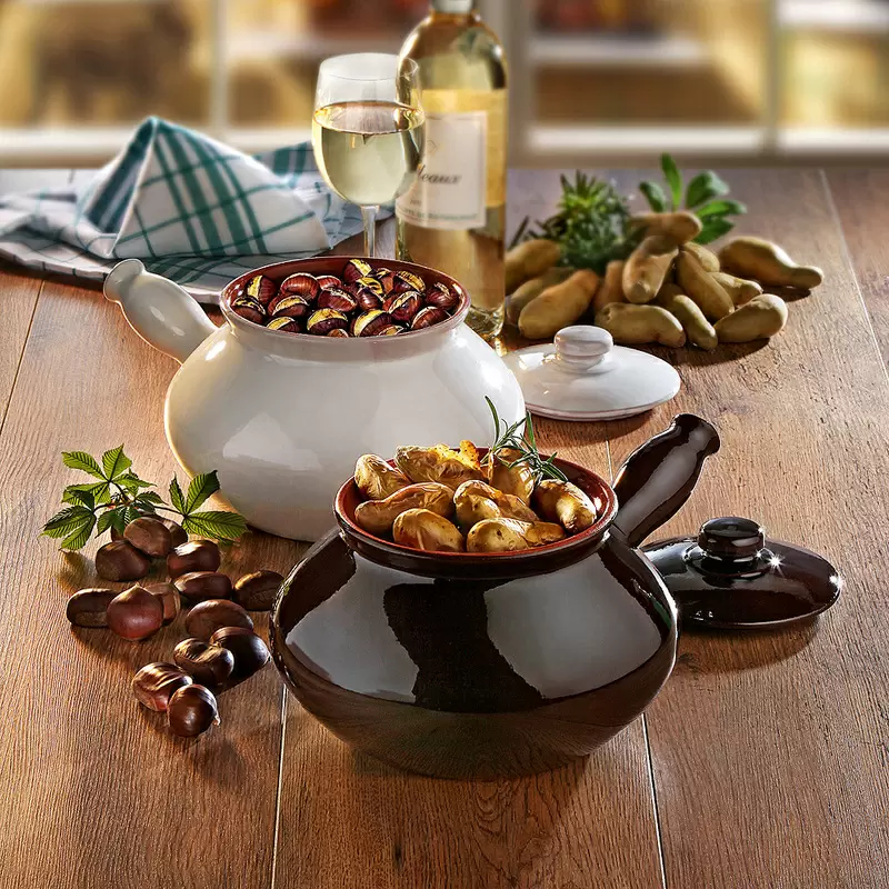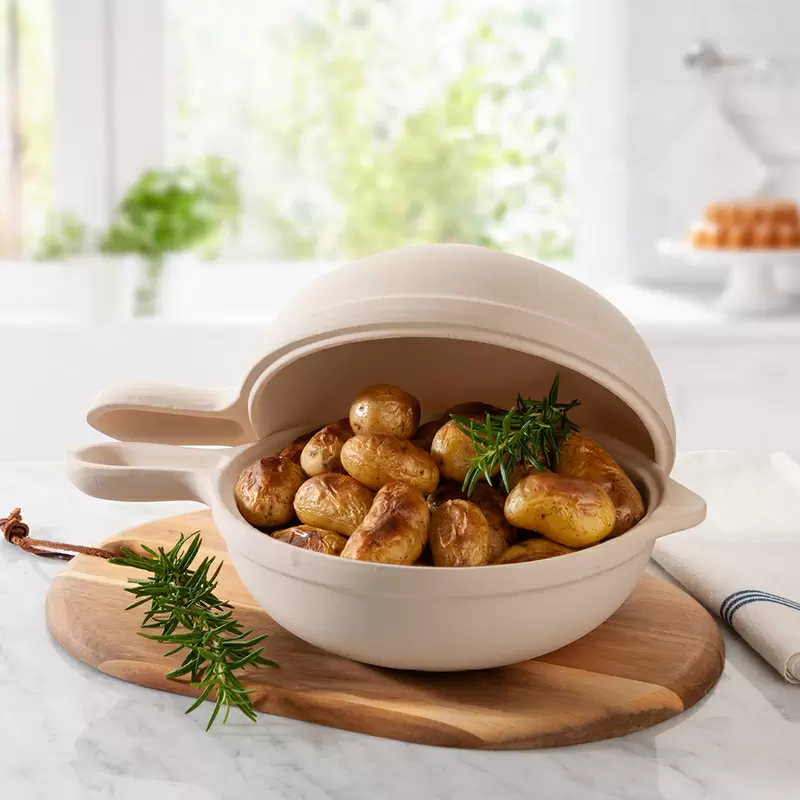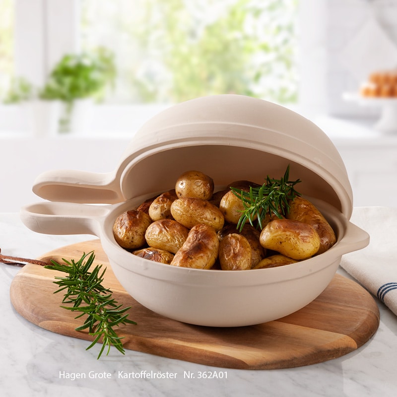 Gewaschene Kartoffeln mit Schale ohne Wasser in den unteren Teil des Rösters füllen. Deckel auflegen und bei 220 °C für 45 Minuten im Backofen garen.