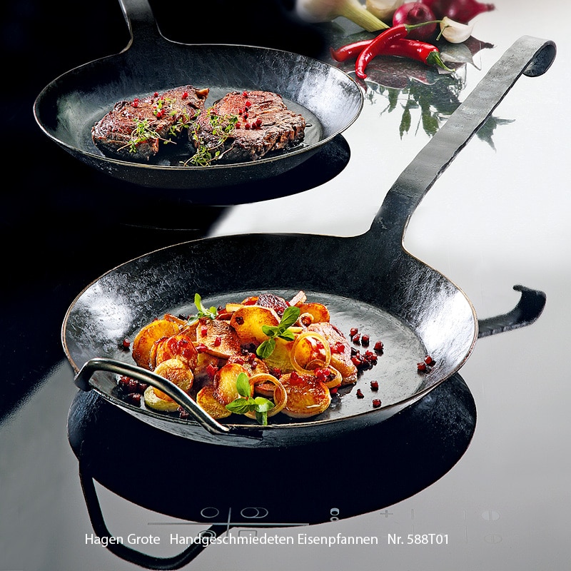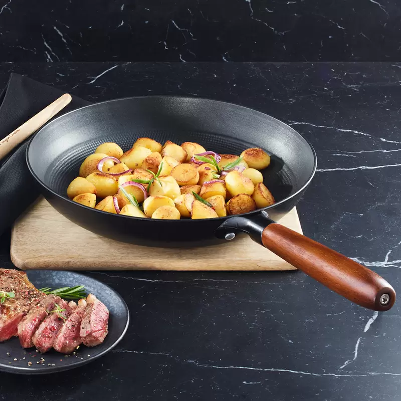 Unsere Gusseisen-Pfanne statten wir mit einer speziellen 3-fachen Wabenstruktur-Antihaftbeschichtung aus. In den winzigen Vertiefungen, die an Bienenwaben erinnern, haftet das Bratfett ganz fein über die gesamte Pfanne verteilt, statt an einer Stelle zusammenzulaufen.