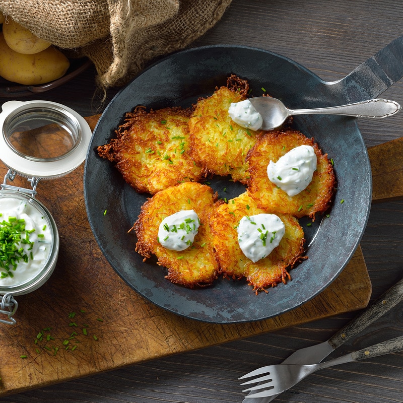Ebenso viel Fingerspitzengefühl erfordert diese Zubereitungsart. Drücken Sie die geriebenen Kartoffeln gut aus. Dann kommen Ei, Zwiebel und etwas Mehl oder Haferflocken hinzu. Zum Ausbacken verwenden Sie am besten ein hocherhitzbares Fett. Sobald sich ein brauner Rand bildet, können Sie die Puffer wenden.