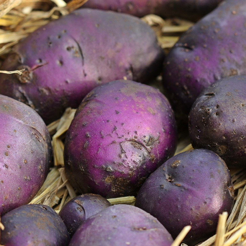 Bei dieser alten Sorte, auch Congo genannt, hier ist nicht nur die Schale blau, sondern auch das Fleisch blau-marmoriert. Verantwortlich für die Färbung sind die Anthocyane. Schöner Nebeneffekt: Die Farbpigmente schützen den Körper vor freien Radikalen. Die vorwiegend festkochende, mittelfrühe bis späte Sorte behält auch beim Kochen ihre intensive Farbe.