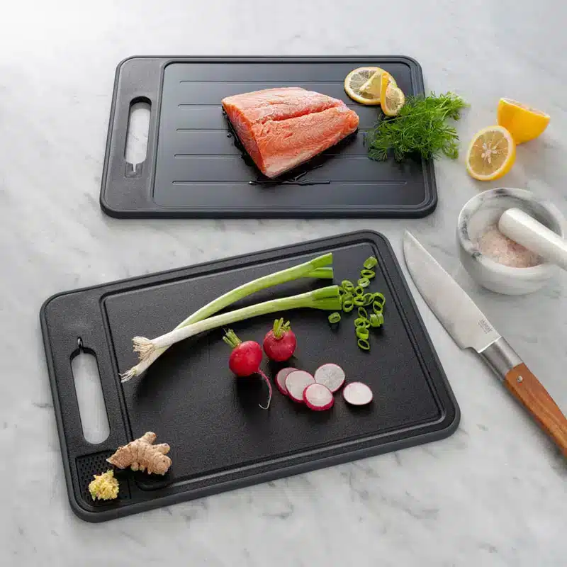 Die soliden Arbeits- und Servierbretter entstehen aus 5 cm starker Akazie aus nachhaltigem Anbau. Die schöne Optik, angenehme Haptik und hohe Widerstandsfähigkeit machen das Küchenbrett zu einem treuen und langlebigen Begleiter.