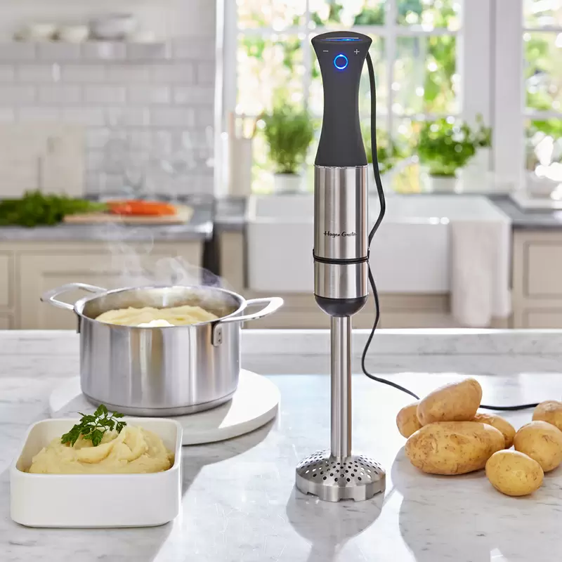Die starke Antriebseinheit verwandelt durch einfaches Aufstecken das Zubehör zu drei erstklassigen Arbeitsgeräten. Bei stufenlos regulierbarer Geschwindigkeit bis 17.000 Umdrehungen gelingt mit dem Stabmixer feinstes Zerkleinern, Emulgieren, Aufschäumen von Suppen, Saucen, Pürees.