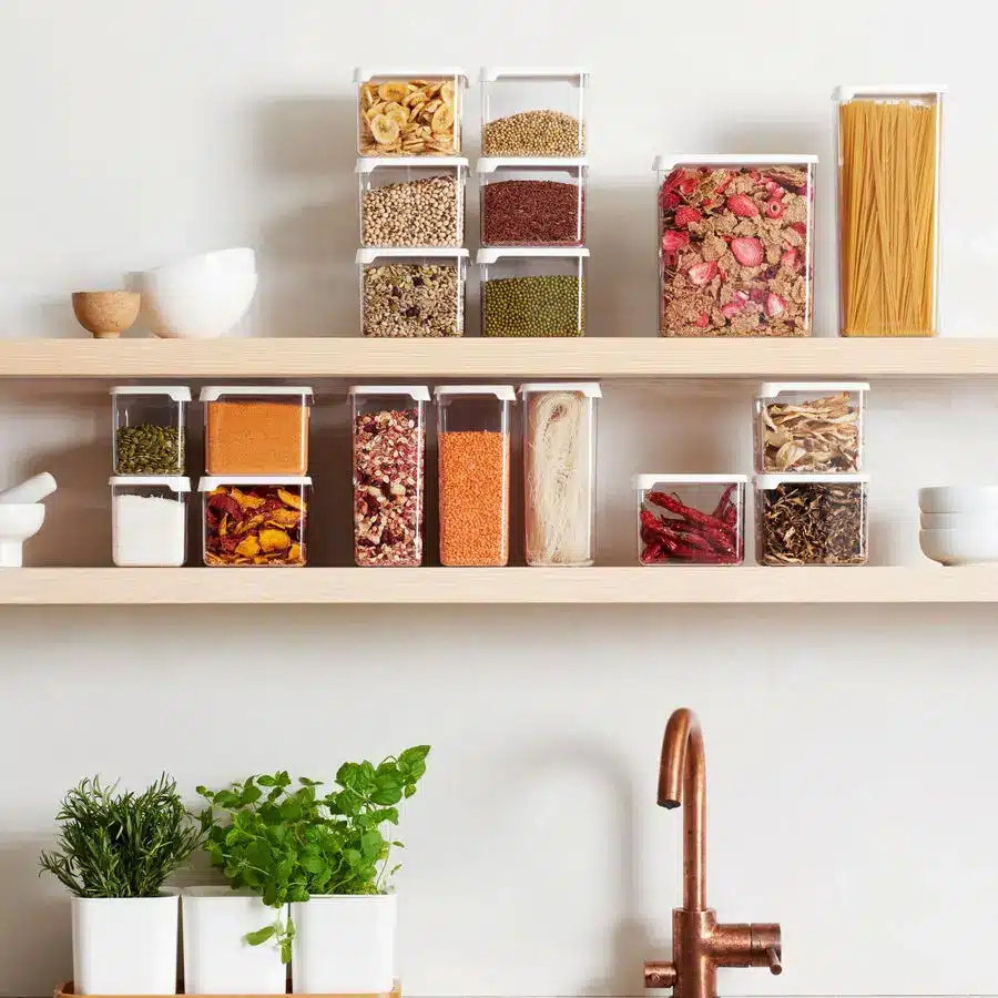 Dank dieser transparenten Behälter haben Sie jetzt alle Vorräte ständig im Blick. Lebensmittelgerechte Spezialdichtungen in den luft- und wasserdicht schließenden, ebenfalls transparenten Deckeln bewahren appetitliche Frische. Untereinander stapelbar, alle Maße auf handelsübliche Packungsgrößen sowie auf Küchenschrank-, Schubladen-, Kühlschrankmaße abgestimmt.