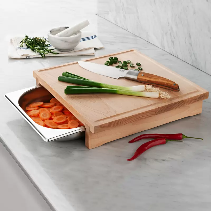Die soliden, standsicheren Schneidbretter fertigen wir aus 2 cm starker heimischer Buche. Darauf fertiggestellte Zutaten kommen sauber getrennt vom Abfall in die herausziehbaren Edelstahl-Auffangwannen.