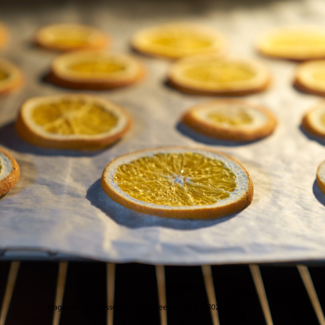 Auch der Backofen kann zum Dörren genutzt werden. Dazu das Dörrgut auf mit Backpapier ausgelegte Gitterroste legen und den Ofen auf 40-50 °C einstellen (bei Kräutern niedriger). Wichtig: Damit die feuchte Luft entweichen kann, muss der Backofen einen Spalt weit geöffnet bleiben. Das geht am besten, indem man einen Holzkochlöffel in die Tür einklemmt. Das Problem ist jedoch, dass sich bei den meisten Backöfen die Temperatur in einem so niedrigen Bereich nicht exakt einstellen lässt. Das ist beim Dörren jedoch wichtig – denn ansonsten misslingt das Dörrgut schnell. Tipp: Falls Sie den Backofen zum Dörren nutzen, verwenden Sie zusätzlich ein Thermometer, um die genaue Temperatur stets im Blick zu haben.