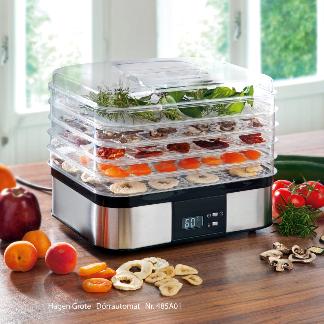 Die mit Abstand besten Ergebnisse erzielen Sie mit einem hochwertigen Dörrautomat . Die kompakten Automaten verfügen über ein Heizelement mit Gebläse. Darüber befinden sich übereinander stapelbare Gitterelemente, auf welche die Lebensmittel verteilt werden. Für ein gelungenes Ergebnis sollten die Stücke oder Scheiben neben- und nicht übereinander liegen. So kann der warme Luftstrom das Dörrgut ungehindert umströmen. Hochwertige Dörrautomaten halten exakt die vorgegebene Temperatur, der Timer regelt die Dörrzeit. Viele Automaten ermöglichen zudem das Dörren in Rohkost-Qualität (bis 40 °C), bei dem besonders viele Vitamine erhalten bleiben. Bei dieser Dörrmethode ist die Haltbarkeit allerdings kürzer. Insgesamt ist ein Dörrautomat deutlich energieeffizienter als der Backofen.