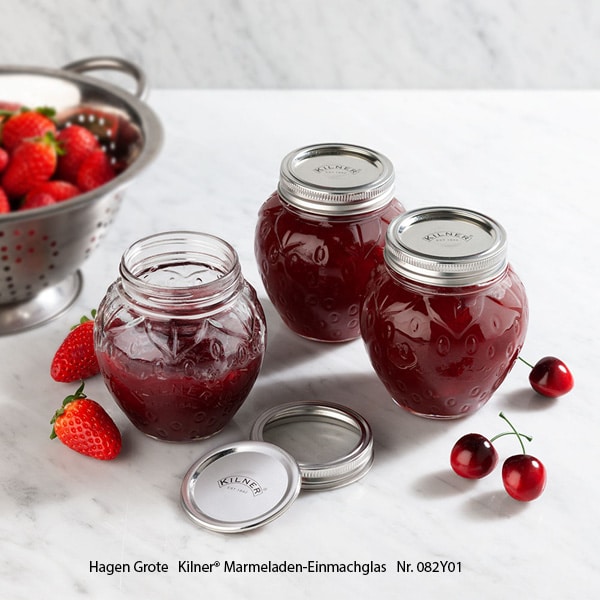 Zum Einmachen von Obst, Marmeladen und Mus sind Einmachgläser mit Schraubdeckel (Twist-off) ideal. Kilner® Marmeladen-Einmachgläser verfügen über einen Spezialdeckel mit Vakuum-Siegel, das bis zu 10-mal wiederverwendbar ist. Bereits 1842 erfanden John Kilner & Co. die Gläser mit der ausgefeilten Deckeltechnik. Ein besonderer Hingucker ist ihr dekorativer Erdbeer-Prägedruck.