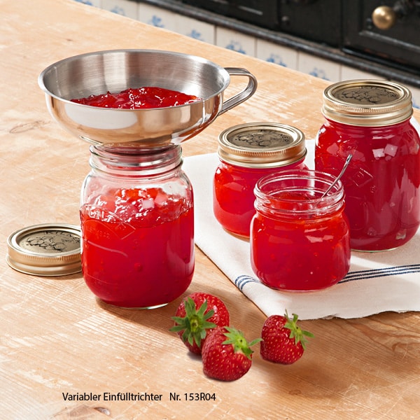 2. Sind die Lebensmittel je nach Rezeptur verarbeitet worden, werden sie sofort in die sterilisierten Gläser gefüllt. Damit das saubere Einfüllen gelingt, verwenden Sie am besten Einfülltrichter, wie unseren lebensmittelgerechten Trichter aus säurefestem Edelstahl. Kalte Gläser können beim Einfüllen heißer Flüssigkeiten zerspringen, daher empfiehlt es sich, die Gläser auf ein Geschirrtuch zu stellen, welches Sie vorher mit warmem Wasser befeuchten.
