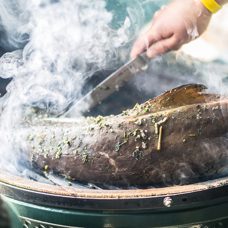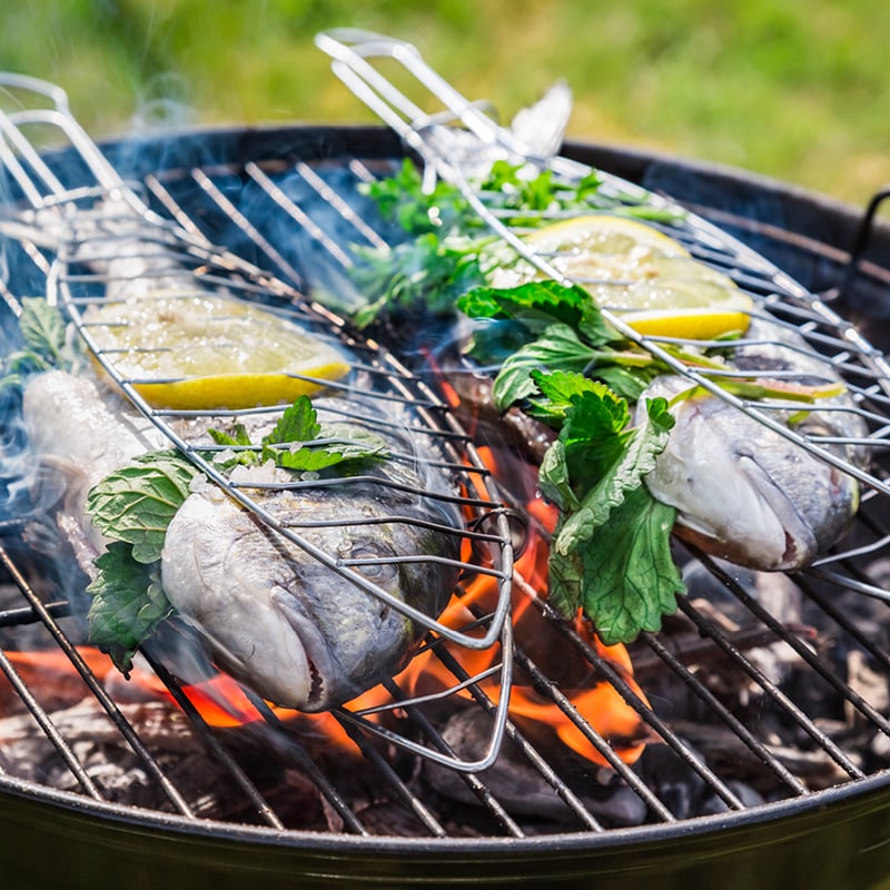 Zum Grillen auf dem Holzkohlegrill eignen sich festfleischige ganze Fische wie Dorade, Loup de Mer (Wolfsbarsch), Forelle und als Fischfilet Lachs. Ganze Fische werden gewürzt und mit Kräutern gefüllt. Alle 3 cm sollte beidseitig die Haut schräg eingeschnitten werden, damit sie nicht unkontrolliert aufplatzt. Mit Öl einpinseln und in Alufolie, mit der glänzenden Seite nach innen, einschlagen. Wenn man ein Schüsschen Weißwein in die Umhüllung gibt, bleibt der Fisch besonders saftig. Die Verwendung von Fisch Grillkörbchen sind beim Wenden und entnehmen des Fische eine schöne Erleichterung. Fisch Filets sollten in Alu Grillschalen zubereitet werden. Ganze Fische sind je nach Größe in etwa 10 bis 15 Minuten gar, für Fischfilets reichen 8 Minuten Garzeit. Bei ganzen Fischen, erkennt man dies daran, dass sich die Rückenflosse leicht herauslösen lässt.