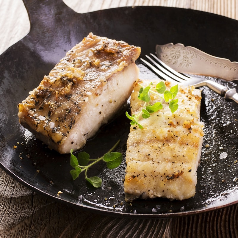 Zum Braten in der Pfanne eigenen sich kleinere Fische im Ganzen oder Fischfilets besonders gut. Ganze Fische waschen, trockentupfen, salzen und mit Mehl einstäuben. Überschüssiges Mehl abklopfen. Am besten gelingt das mit Roggenmehl, es erzeugt besonders schöne Krusten. In geklärter Butter (Butterschmalz) oder einer Mischung aus Olivenöl und Butter von beiden Seiten bei mittlerer Hitze schön braun braten. Fischfilets, möglichst mit Haut, ebenso wie ganze Fische vorbereiten. In der Pfanne auf der Hautseite fast ganz durchgaren. Erst zum Schluss wenden und nur sehr kurz auf der Fleischseite kross fertigbraten. Mehlierten Thun- oder Schwertfisch nur superkurz braten, da er sonst hart und trocken wird.