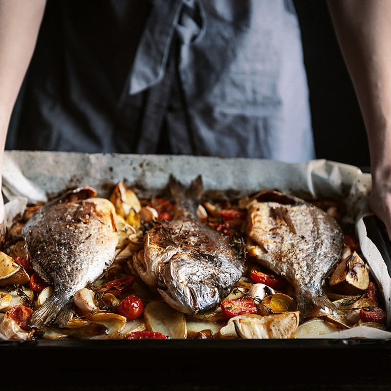 Größere Fische, die im Ganzen gegart werden sollen, lassen sich am besten im Ofen zubereiten. Dafür werden sie nach dem Säubern und Trockentupfen innen und außen mit Salz und Pfeffer eingerieben. Die Bauchhülle wird mit Kräutern gefüllt und außen mit Öl eingepinselt. In einer Kasserolle oder auf einem Gemüsebett garen ganze Fische im vorgeheizten Ofen bei 180 °C je nach Größe etwa 25 Minuten.