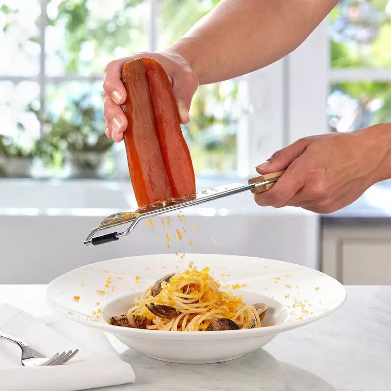 Bis heute wird Bottarga di Muggine nach einem jahrtausendealten, handwerklichen Verfahren aus dem Rogen der Meeräsche gewonnen. Gesalzen, getrocknet und in seine unverkennbare, länglich-ovale Form gebracht durchläuft die Spezialität mit der leuchtend orangen Farbe den Reifungsprozess.