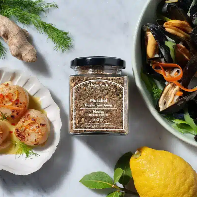 Hervorragend verfeinern Sie Muscheln auch mit unserer Gourmet Gewürzmischung für Muscheln und Krustentiere , die das feine Aroma von Salzwassermuscheln perfekt unterstreicht. Nach unseren anspruchsvollen Kriterien kultivierter Oregano, Dill, Thymian, Koriander, Piment, Nelken, Lorbeerblätter und Sellerie sorgen für eine feine Kräuter-Basis. Gemeinsam mit der angenehmen Frische von Zitronenschalen, einer warmen Schärfe von Pfeffer, Chili und Ingwer sowie der feinen Würze von Senfsaat ergibt sich eine ausgefeilte Geschmackskomposition.