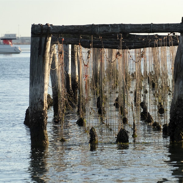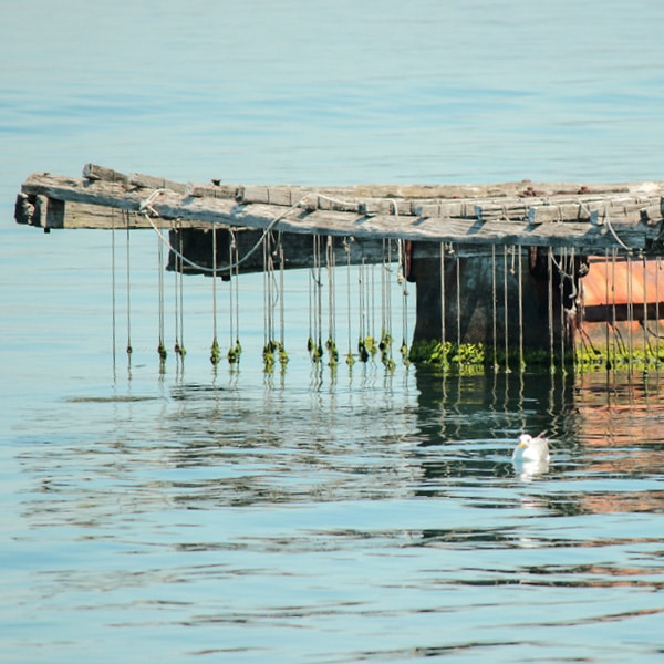 Mittelmeer Miesmuscheln sind breiter und größer als ihre nordeuropäischen Verwandten. Die Sorte stammt zwar aus dem Mittelmeer, wird aber hauptsächlich an der spanischen Atlantikküste von Kap Finisterre bis an die portugiesische Grenz gezüchtet. In den tiefen, fjordähnlichen Einschnitten und Meeresbuchten, den Rias Baixas, gedeihen sie an von Flößen herabhängenden langen Seilen. Die natürlichen Meeresbewegungen durch Ebbe und Flut umspülen die Miesmuscheln ständig mit frischem, sauerstoffreichem Meerwasser. Da sie den Boden nicht berühren, sind sie frei von Schlick und Sand. Mediterrane Muscheln werden ab einer Größe von etwa 10 cm angeboten.