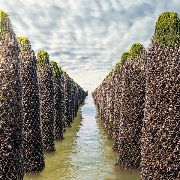 Nordeuropäische Miesmuscheln werden vorwiegend in Frankreich, Deutschland und den Niederlanden gezüchtet. In Frankreich wachsen Miesmuscheln traditionell an Holzpfählen, den „bouchots“, die in langen Reihen tief in den Untergrund gerammt werden. Die nach dieser Zuchtmethode „moules de bouchot“ genannten Miesmuscheln sind klein, gegenüber deutschen oder holländischen Muscheln jedoch etwas fleischiger und von feinem Geschmack. Schon innerhalb eines Jahres wachsen sie zur marktreifen Größe von 7 cm heran.