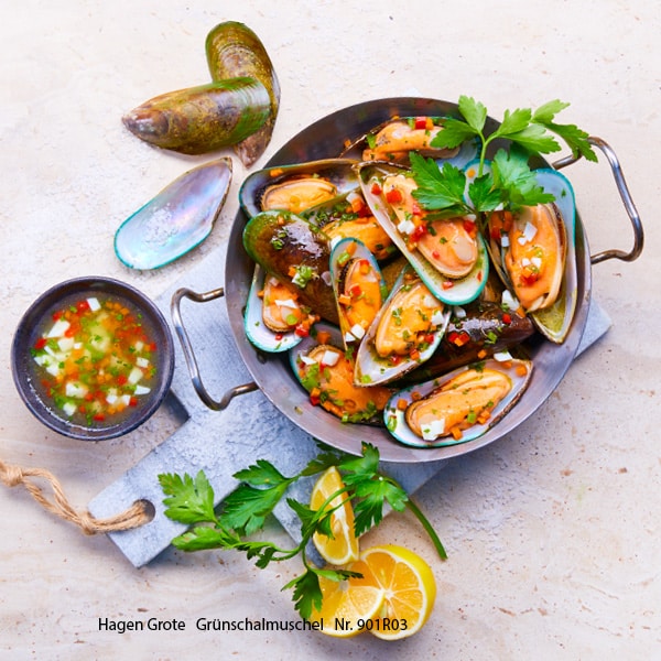 Grünschalen-Miesmuscheln, auch Grünschalmuschel genannt, sind eine neuseeländische Delikatesse. Sie werden nachhaltig in Aquakulturen gezüchtet, um die begrenzten, wild vorkommenden Bestände zu schonen. Sie sind größer und fleischiger als unsere europäischen Exemplare. Optisch unterscheiden sie sich durch einen leuchtend smaragdgrünen Streifen am äußeren Schalenrand. Angeboten wird sie ab einer Größe von 10 cm, ausgewachsen erreichen sie auch Größen von 15 oder sogar 20 cm. Ihr zartes, lachsfarbenes Fleisch ist von angenehm fester Konsistenz. Geschmacklich sind sie unter allen Miesmuscheln eine besondere Delikatesse mit einem intensiven, angenehm würzigen Muschelgeschmack. Sie sind für Neuseeland der zweitwichtigste Seafood-Exportartikel. Wegen des langen Transportweges bietet wir unsere Hagen Grote Grünschalen Miesmuscheln tiefgefroren an.