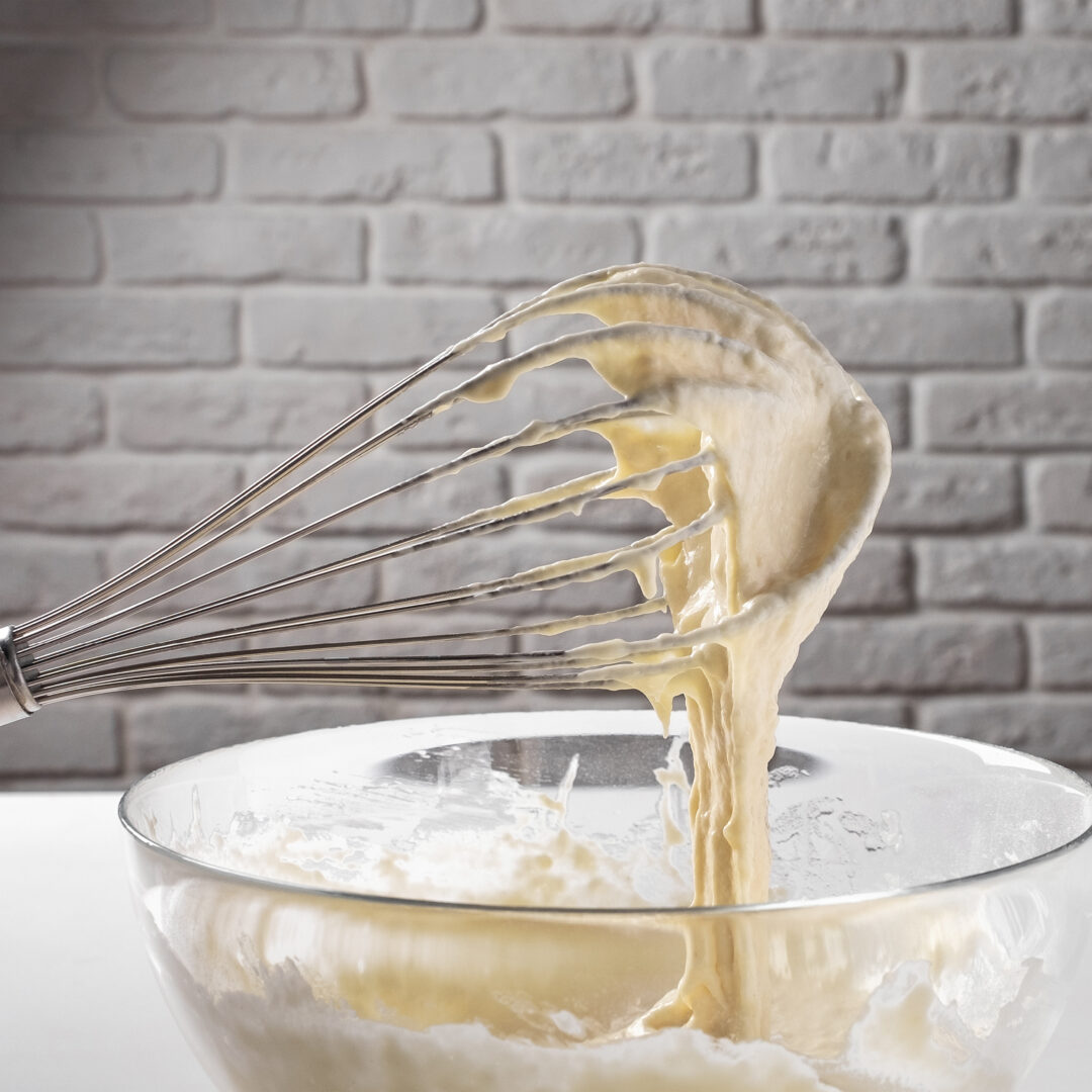 Mit der sogenannten Reißprobe lässt sich leicht feststellen, ob Rührmasse die optimale Konsistenz hat. Das ist nämlich dann der Fall, wenn sie sich nur schwer reißend von einem Schneebesen löst.