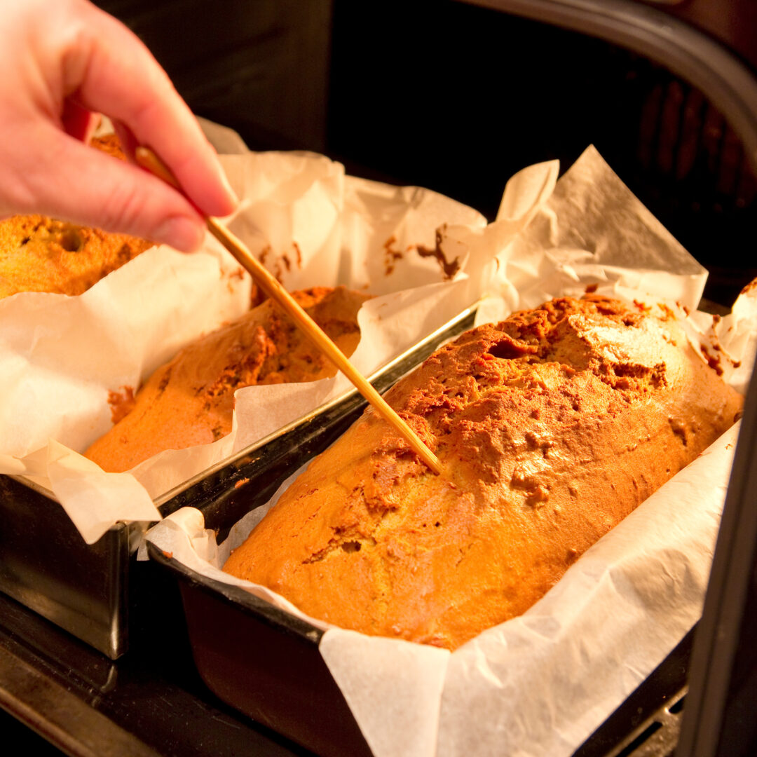 Mithilfe der bekannten Stäbchenprobe lässt sich auch bei Rührkuchen und -gebäcken kurz vor Ende der Backzeit der Garzustand feststellen. Einfach mit einem Holzspießchen in die Mitte des Backwerks einstechen. Kommt es trocken heraus, ist der Kuchen fertig. Bleibt Teig kleben, benötigt er noch etwas mehr Zeit.