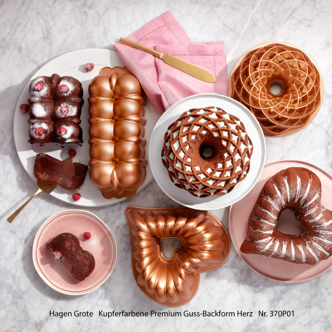Die 3 hochwertigen kupferfarbenen Premium Guss-Backformen der Hagen Grote Sonderedition aus dickwandigem Gussaluminium kombinieren höchste Wärmeleitfähigkeit mit gleichmäßiger Hitzeverteilung. Das garantiert perfekte Backergebnisse.