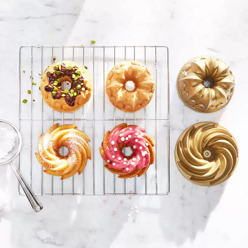 Ebenfalls zu Ihrem Backvergnügen tragen die richtigen Formen bei. Optimal ist etwa unser Guss-Backformen-Set: Das dickwandige Gussaluminium verfügt über hervorragend Wärmeleiteigenschaften. Es sorgt für eine besonders gleichmäßige Hitzeverteilung und somit für überzeugende Backergebnisse. Die wunderschönen Details der prachtvollen Kuchen lassen sich dank doppelter Antihaftbeschichtung unbeschadet herauslösen und ermöglichen Ihnen völlig neue, kreative Möglichkeiten des Verzierens. Auch als Mini-Gussbackformen für je 4 dekorative Küchlein erhältlich.