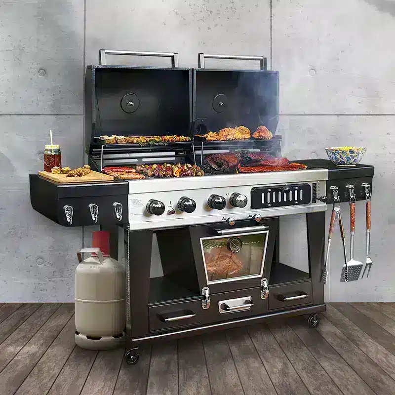 Dieser luxuriöse Grill vereint Vorzüge unterschiedlicher Energiequellen und Kochtechniken. Gegrillt wird klassisch mit Holzkohle oder wahlweise auf Gas.