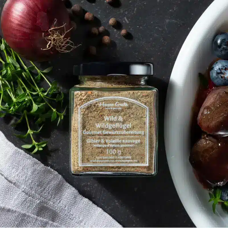 Am besten harmoniert Wildfleisch mit Thymian, Rosmarin, Pfeffer, Liebstöckel, Piment, Lorbeerblättern, Wacholder und Nelken. Perfekt eignet sich auch unsere Gourmet Gewürzzubereitung Wild & Wildgeflügel aus Kräutern und Gewürzen weltbester Anbaugebiete. Saucen lassen sich auch mit etwas Lebkuchengewürz sowie mit Schwarzbier oder Bitterschokolade ausgezeichnet verfeinern. Salz hingegen sparsam verwenden.