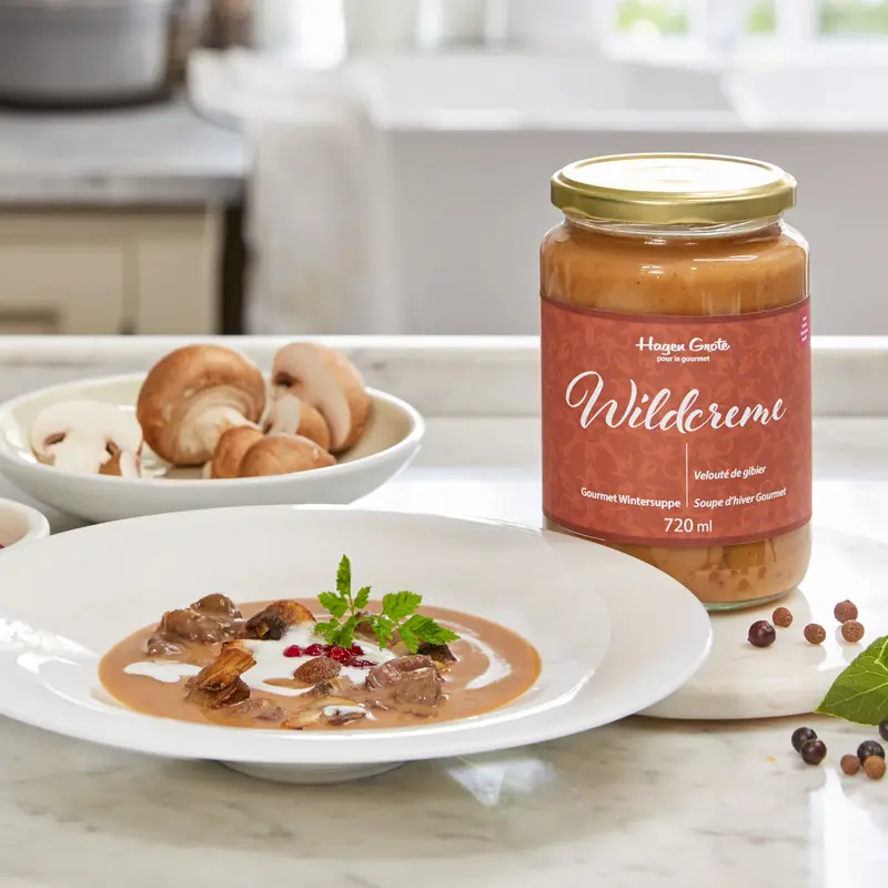 In der Hagen Grote Delikatessen-Manufaktur fertigen wir diese elegante Suppe auf Basis von feinem Wildfond und bestem Hirschfleisch. Frische Pilze, Sahne, Rotwein, etwas Thymian und Rosmarin runden den Geschmack dieses Klassikers der Gourmet-Winterküche ab.