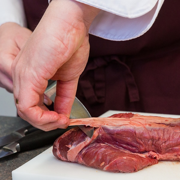 Spülen Sie das Wildfleisch vor der weiteren Zubereitung mit klarem Wasser ab und tupfen es dann mit Küchenpapier trocken. Anschließende die Außenhaut, Silberhäute und Sehnen mit dem Messer entfernen. Dabei immer großzügig vorgehen, da diese Teile sonst bei der Zubereitung zäh werden. Überschüssiges Fett ebenfalls vorab entfernen.