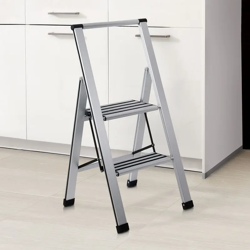 Extrabreite Stufen mit Antirutschprofil, fester Stand und oberer Haltebügel garantieren höchste Sicherheit. Mit einem Griff auf 5,5 cm zusammengeklappt, passt die Leiter in die schmalste Nische.