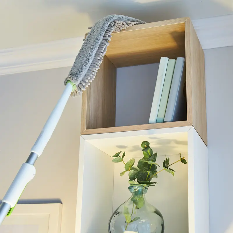 Dank langer Stange und biegbarem Kopf stauben Sie sogar Küchenschränke und Regale einfach von oben ab. Der große doppelseitige Mikrofaserbezug reinigt wahlweise mit glatter oder fransiger Mikrofaser-Oberfläche.