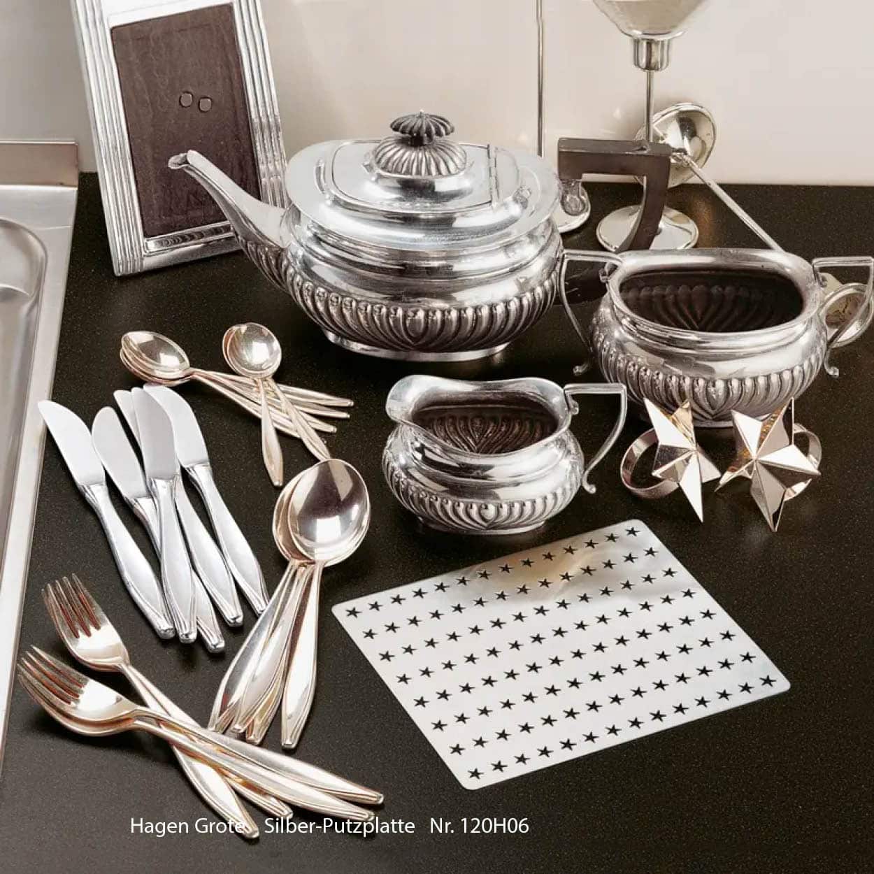 Nutzen Sie den Frühjahrsputz doch auch gleich, um sich einmal Ihres Silbers anzunehmen. Hochwertiges Silberbesteck verleiht dem gedeckten Tisch einen eleganten Glanz, erfordert aber auch regelmäßige Pflege, um sein schönes Aussehen zu bewahren. Es ist ratsam, das Besteck sofort nach Gebrauch zu spülen und gründlich abzutrocknen, um Fleckenbildung zu vermeiden. Optimal dazu geeignet ist unsere Silberputzplatte «Silverstar», die in England erfunden und patentiert wurde. Elektrolyse und eine spezielle Metall-Legierung sind ihr Geheimnis. Einfach die Platte mit ins heiße Spülwasser legen und 1 EL Salz pro Liter Wasser hinzugeben. Nun das Besteck darin spülen und anschließend abtrocknen. Auch Ihr Silberschmuck kann auf diese Weise gereinigt werden. Anschließend muss selbst zuvor stark angelaufenes Silber nicht mehr geputzt oder poliert werden – alles glänzt wieder wie neu. Im Gegensatz zu vielen handelsüblichen Silberpflegemitteln wird dabei nichts von der wertvollen Oberfläche abgetragen. Die Silberputzplatte kann über viele Jahre hinweg verwendet werden.