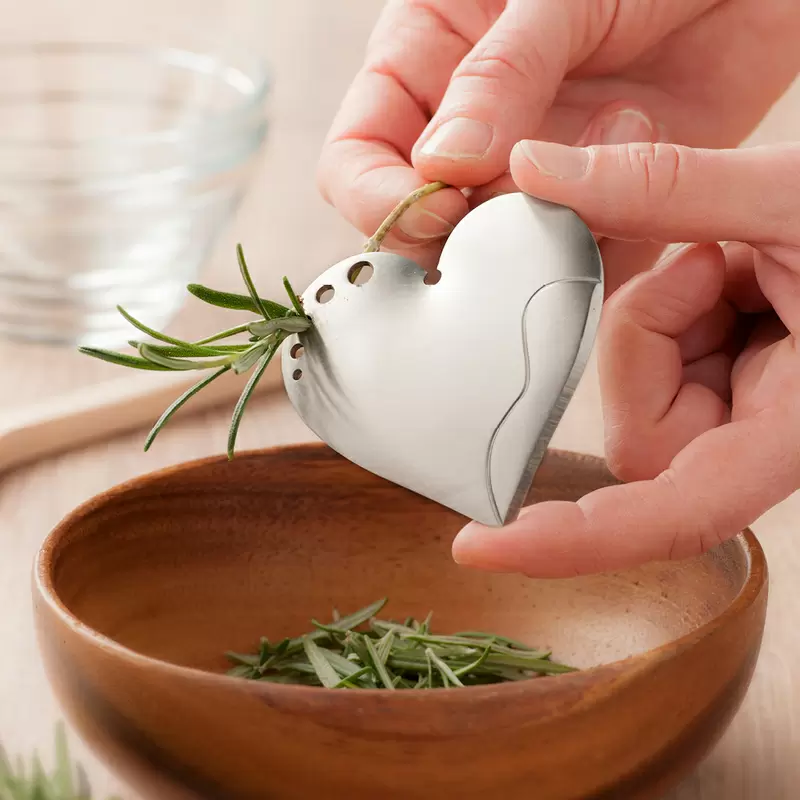 Kräuterzweiglein einfach durch das passende der 5 unterschiedlich großen Löcher ziehen. Größere Stängel oder buschige Petersilie und Basilikum lassen sich mithilfe der Fuge in der Herzmitte mühelos lösen.