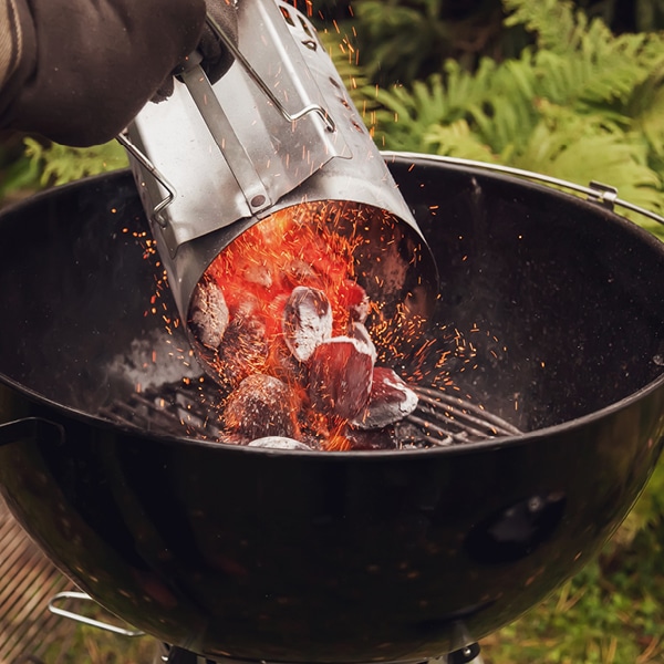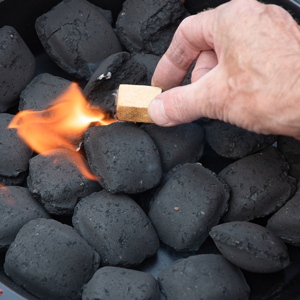 Für das Grillen mit Holzkohle werden lediglich Kohle oder Briketts sowie Grillanzünder benötigt. Statt flüssiger oder fester Grillanzünder, die einen unangenehmen Petroleum-Beigeschmack erzeugen können, ist das Entzünden der Holzkohle in einem Anzündkamin (senkrecht stehender, gelochter Metallzylinder) sinnvoller. Dazu kommen unten zusammengeknülltes Papier oder ein wachsartiger Paraffin-Grillanzünder und oben die Holzkohle oder Grillbriketts hinein. Spätestens nach 15 Minuten ist die Grillkohle durchgeglüht. Nun kommt die restliche Kohle auf den Grill. Nachdem sich eine weiße Ascheschicht über die Kohlen gelegt hat, kann das Grillgut aufgelegt werden. Mit Holzkohle dauert es etwa 20-30 Minuten, Briketts brauchen mit 45-60 Minuten etwas länger. Wird länger als eine halbe Stunde gegrillt, sinkt die Temperatur des Grills und es muss weitere Holzkohle nachgelegt werden.