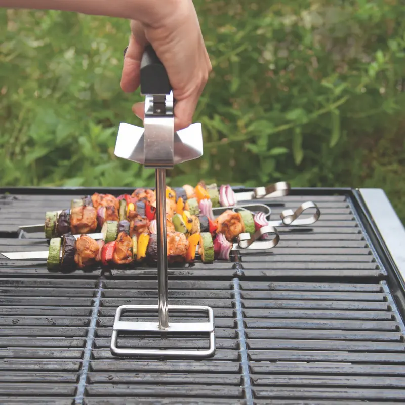 Durch ihre innovative Halterung und abgeflachte Form bleibt alles jederzeit am richtigen Platz. Nichts dreht sich wie bei runden Spießen oder haftet an.