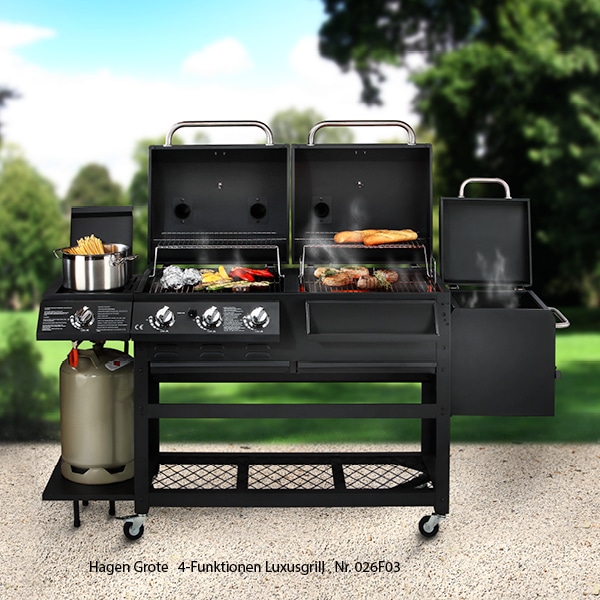 Besonders luxuriös ist unser multifunktionaler Premium-Grill, der verschiedene Energiequellen und Kochtechniken in einem Gerät vereint. Gegrillt werden kann klassisch mit Holzkohle, aber auch mit Gas. Die Smokerbox dient zum Räuchern. Zudem kann sie auch als Offset-Smoker zum Warm- und Kalträuchern, etwa für Wurst- oder Käsespezialitäten, verwendet werden.
